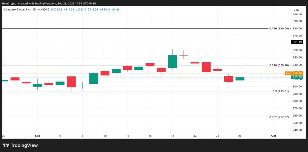 Coinbase closed Friday’s session at $312.59, up 1.92%. The stock is in focus this week, with institutional adoption news fueling investor sentiment.