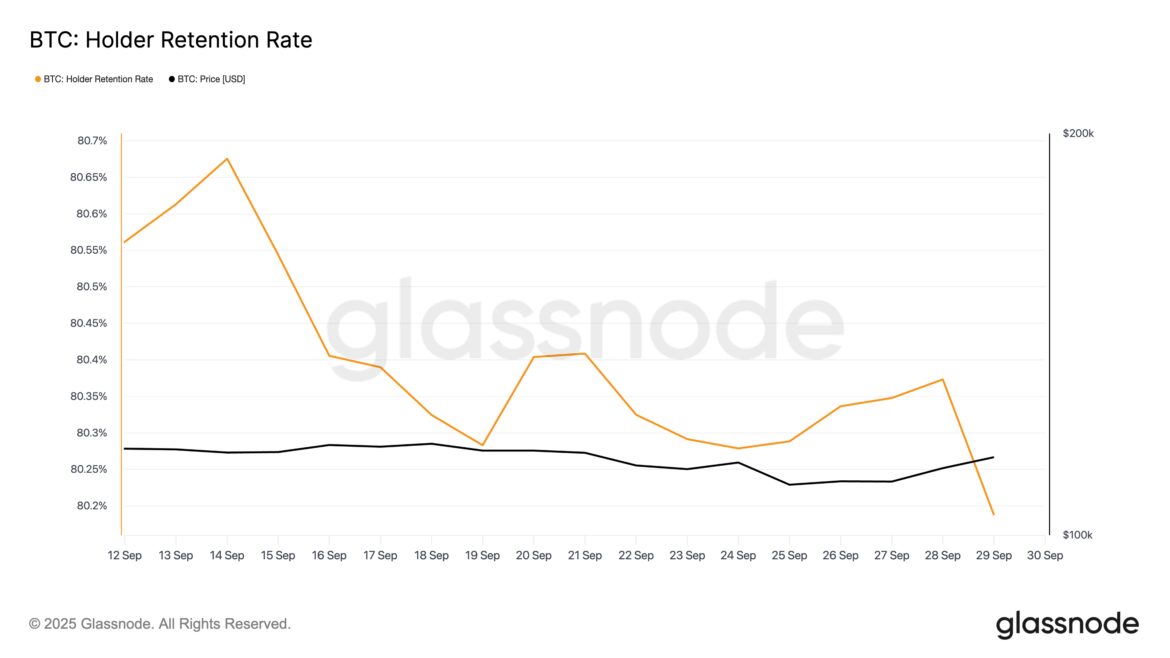 According to Glassnode, Bitcoin’s Holder Retention Rate has steadily declined since September 14 and continues to trend lower. It stands at 80.17% at press time, down 1% in the past 16 days.