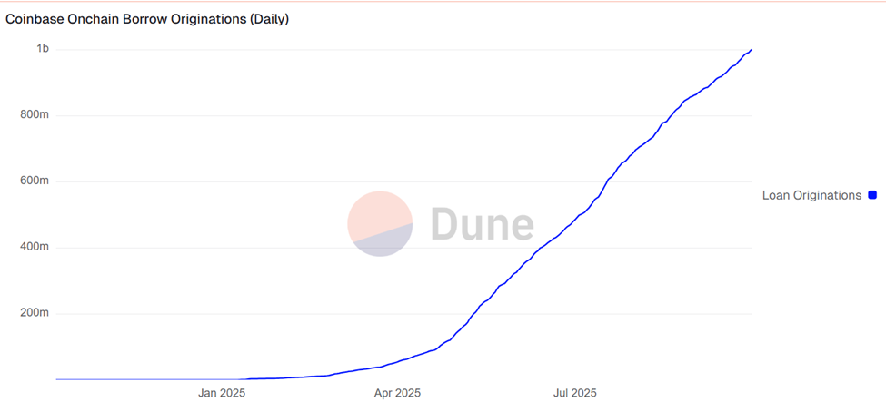 According to Dune Analytics data, Coinbase’s on-chain borrow originations now total $1.003 billion, with $1.449 billion in collateral locked.