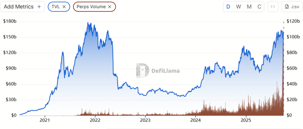 Meanwhile, the contrast with broader DeFi metrics is glaring. While total value locked (TVL) across protocols has yet to reclaim 2022 highs, perp DEX volumes have multiplied many times over.