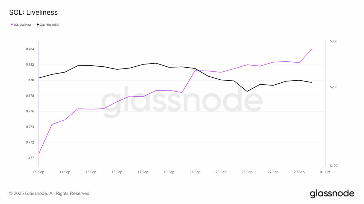On-chain data highlights growing bearishness among long-term holders (LTHs). Solana’s Liveliness metric has spiked in recent weeks, signaling an increase in coins leaving dormant wallets. This behavior suggests LTHs are offloading assets, reducing conviction, and applying downward pressure on the altcoin’s overall price action.