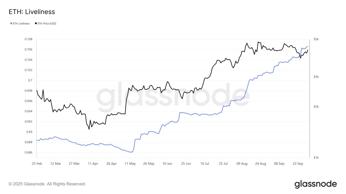 On-chain data shows Ethereum’s Liveliness metric trending higher, a signal that long-term holders continue to sell. This group holds significant influence, and their selling often creates downward pressure on ETH’s valuation. Their recent activity reflects caution and suggests that some larger investors remain unconvinced about near-term sustainability.