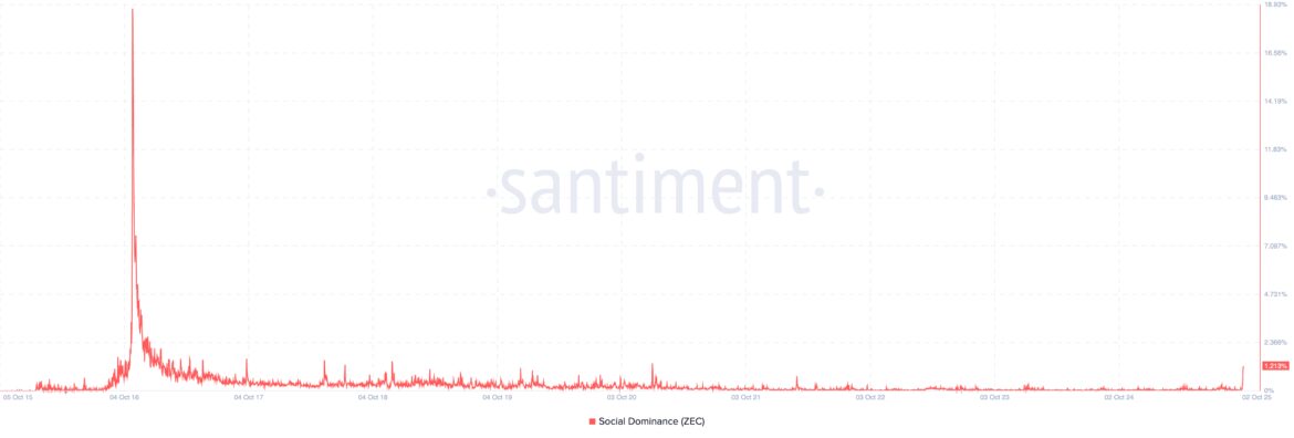 One of the clearest warning signs is ZEC’s social dominance, which has skyrocketed to a five-year high. At press time, this stands at 1.21%, per Santiment’s data.