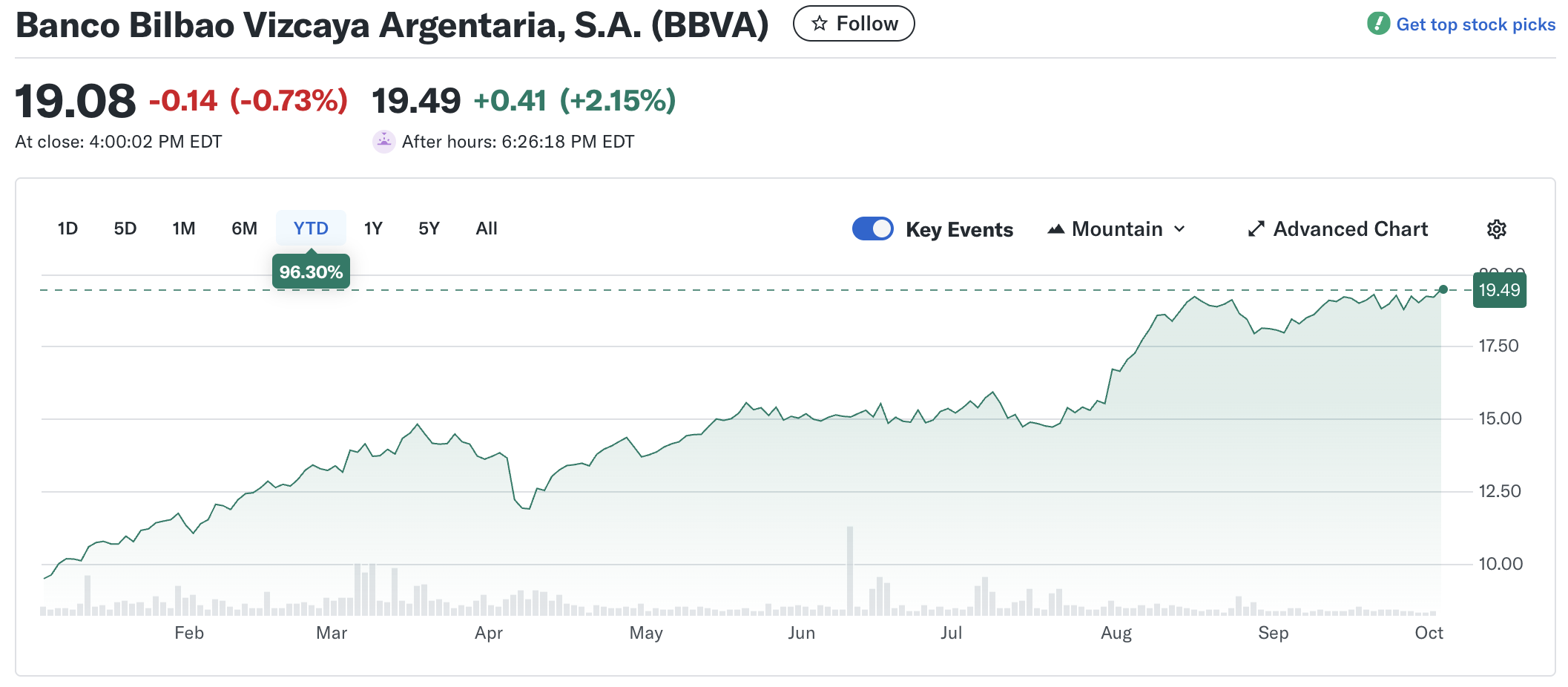 Meanwhile, BBVA shares have also reflected rising interest in the bank’s digital strategy. As of October 2, the stock traded around $19.08, showing steady momentum after earlier gains. Daily volume has exceeded one million shares, highlighting active investor participation.