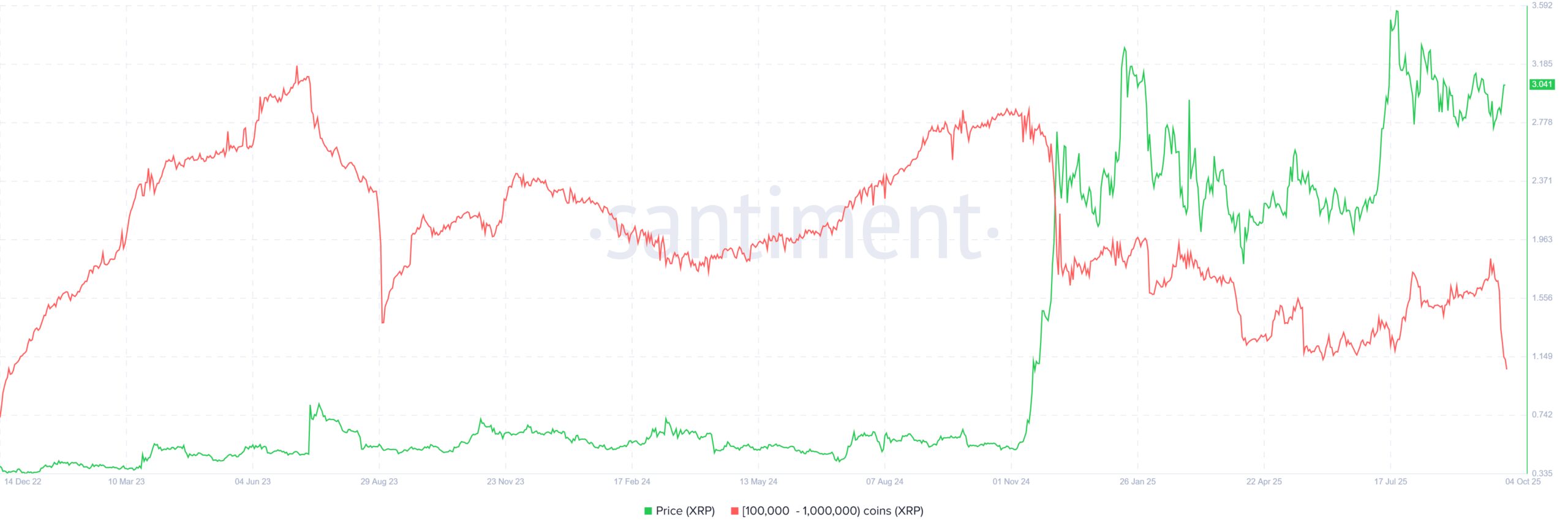 XRP whales have been offloading their holdings over the past several days, contributing to the price slowdown. Addresses holding between 100,000 and 1 million XRP have sold more than 100 million tokens in just 10 days, signaling a noticeable decline in conviction among major investors.