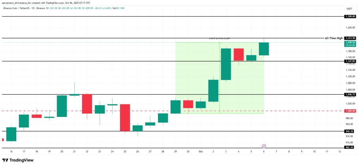 BNB price is trading at $1,209 after forming a new all-time high (ATH) at $1,223, highlighting the cryptocurrency’s strong upward momentum. This surge came after a sharp rebound from the recently established support at $1,147 last week. The asset’s resilience at these levels indicates continued investor confidence.