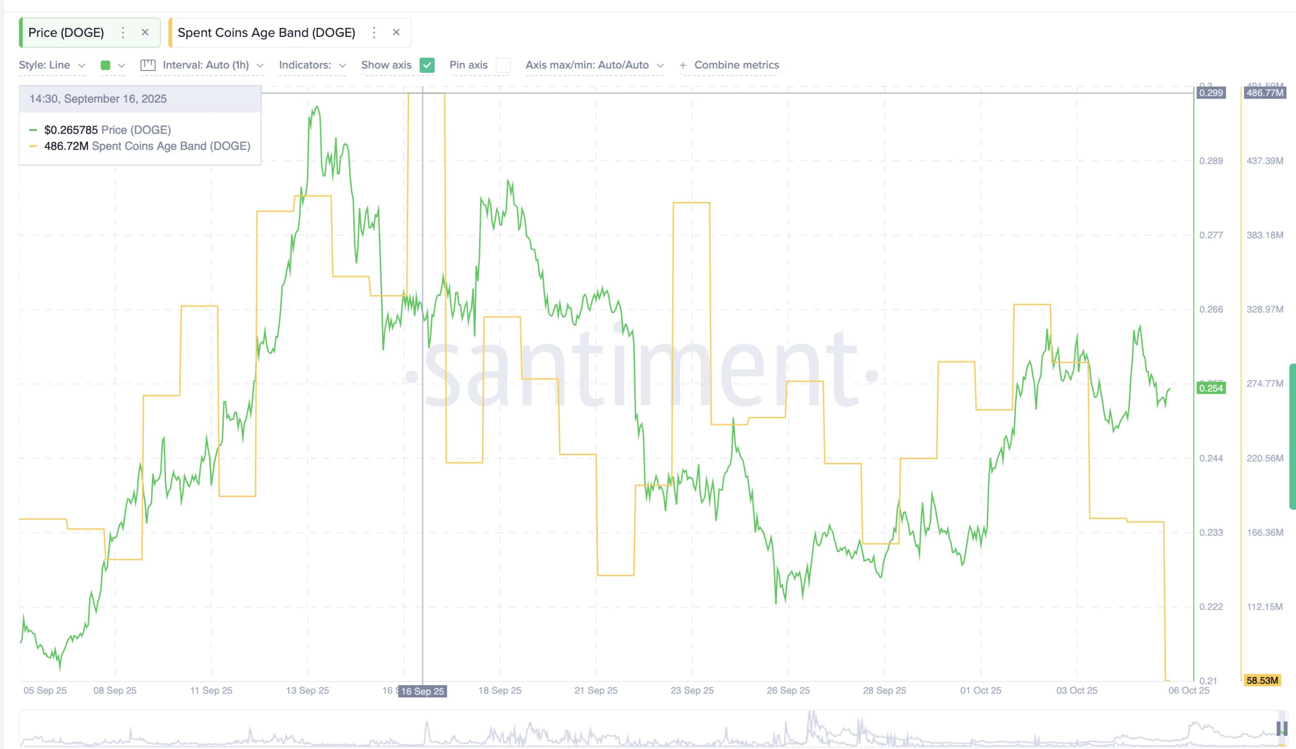 The Spent Coins Age Band, which measures how many coins from different age groups are being moved, has plunged nearly 88% — from 486.7 million DOGE on September 16 to just 58.5 million on October 6. In plain terms, fewer coins are leaving wallets. That includes coins held for as little as a week to as long as a few years.