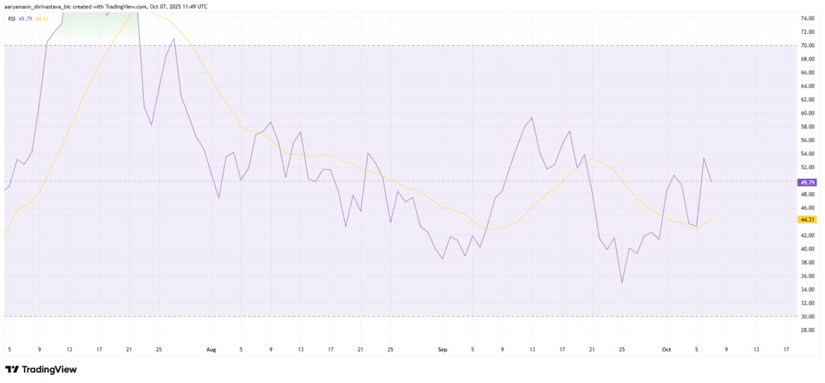 The Relative Strength Index (RSI) for HBAR is climbing steadily, reentering the bullish zone above the neutral 50.0 mark. This shift signals renewed buying interest and improving technical strength. As market-wide sentiment turns positive, indicators suggest that HBAR could soon regain upward momentum if sustained demand persists.