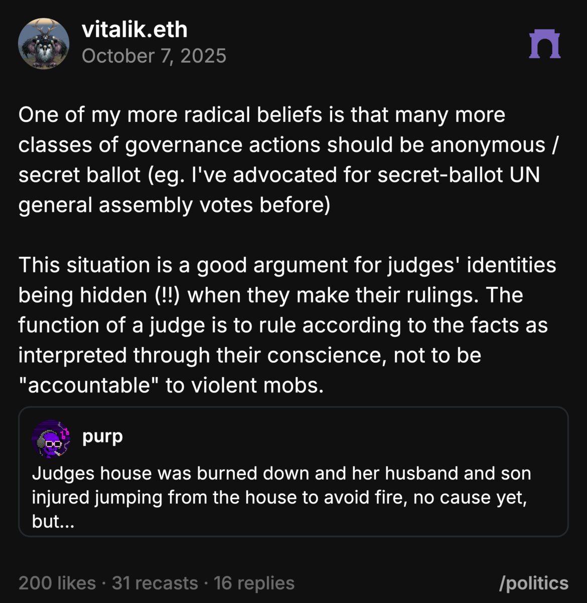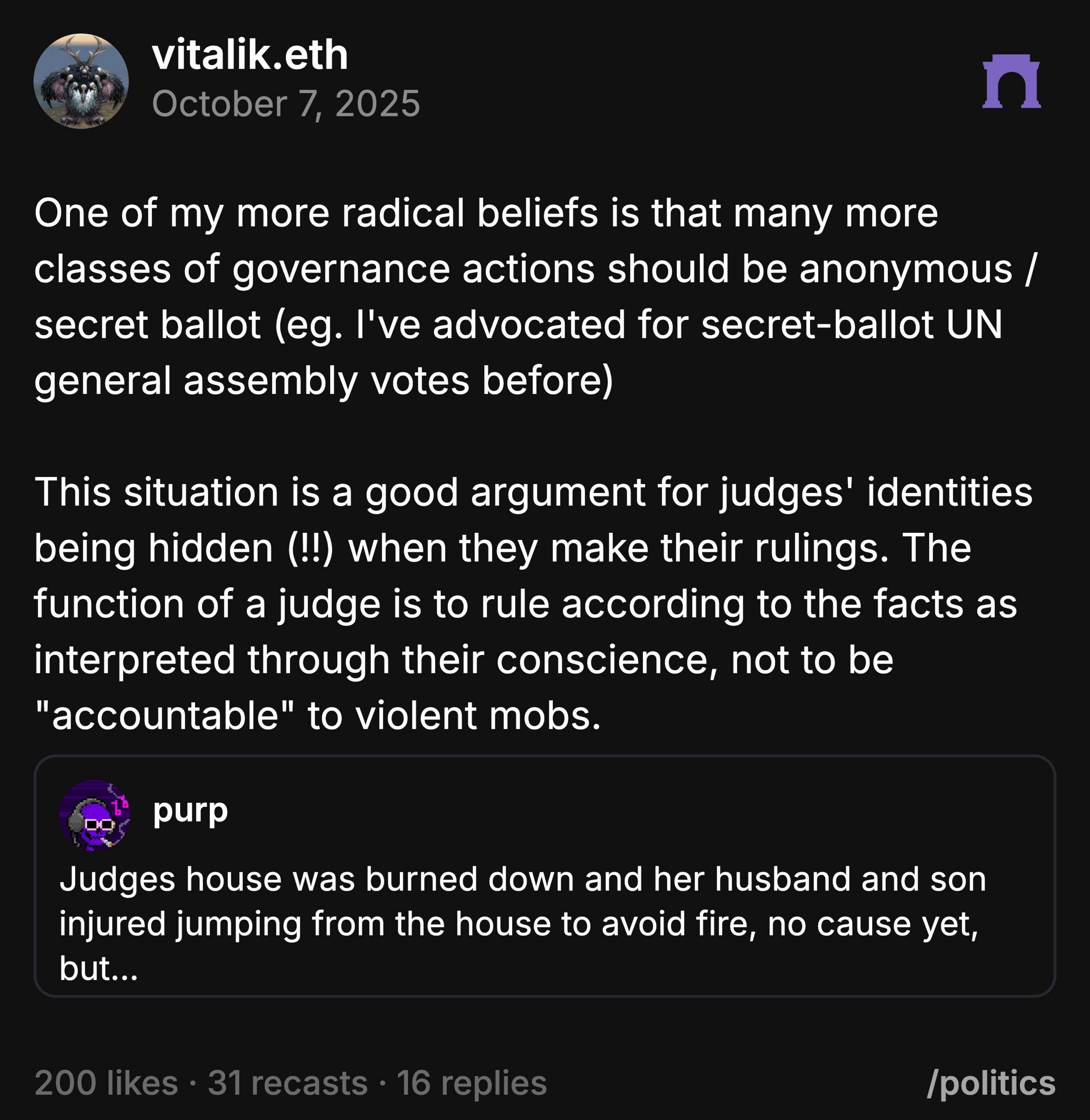 “One of my more radical beliefs is that many more classes of governance actions should be anonymous or secret ballot. I’ve advocated for secret-ballot UN General Assembly votes before.”
