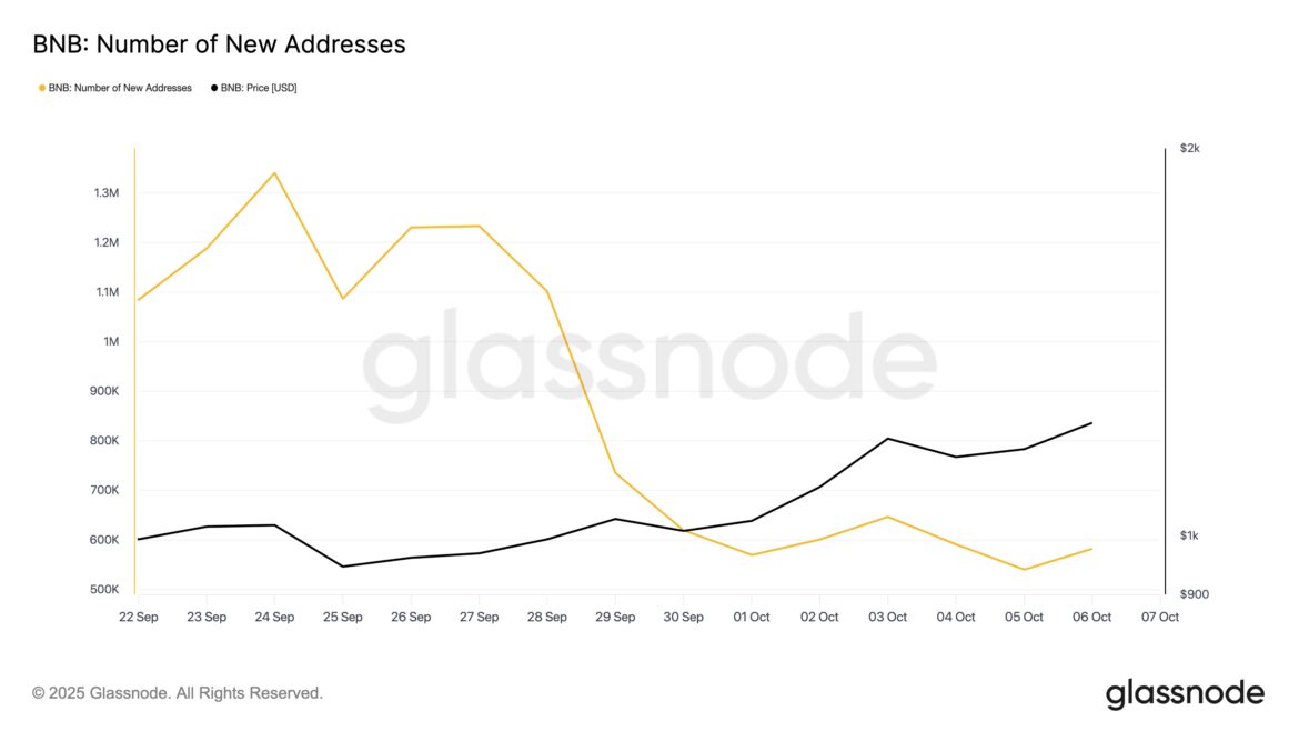 For example, Glassnode data shows that the BNB Chain’s daily new address count has declined by 57% since September 24, marking a sharp slowdown in network growth.