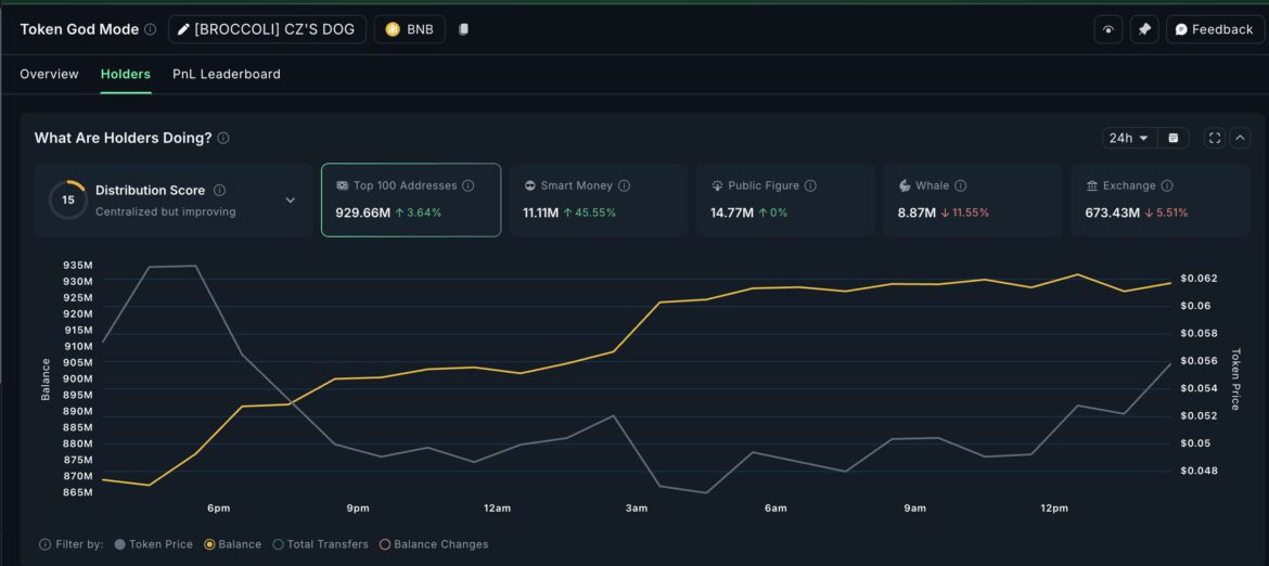 On-chain data shows mixed but telling activity among major holders. In the past 24 hours, whales sold 11.55% of their holdings. That’s equal to around 1.16 million BROCCOLI, or roughly $58,000 at the current price. However, this selling has been offset by smart money addresses. That group added 45.55% to their balance, about 3.47 million BROCCOLI (around $173,000).