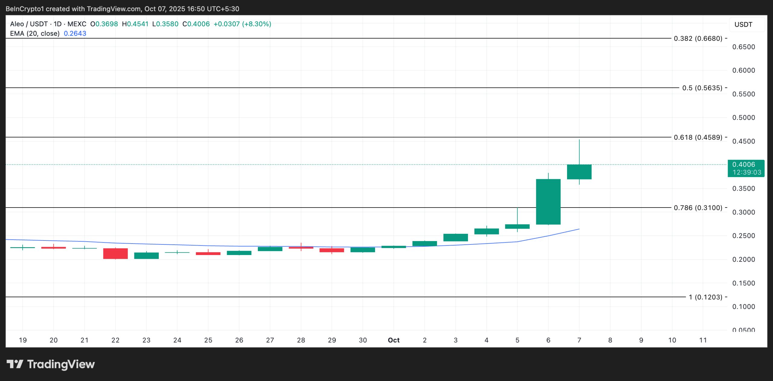 At press time, the coin trades at $0.4006, resting above its 20-day EMA, which forms dynamic support at $0.2643.