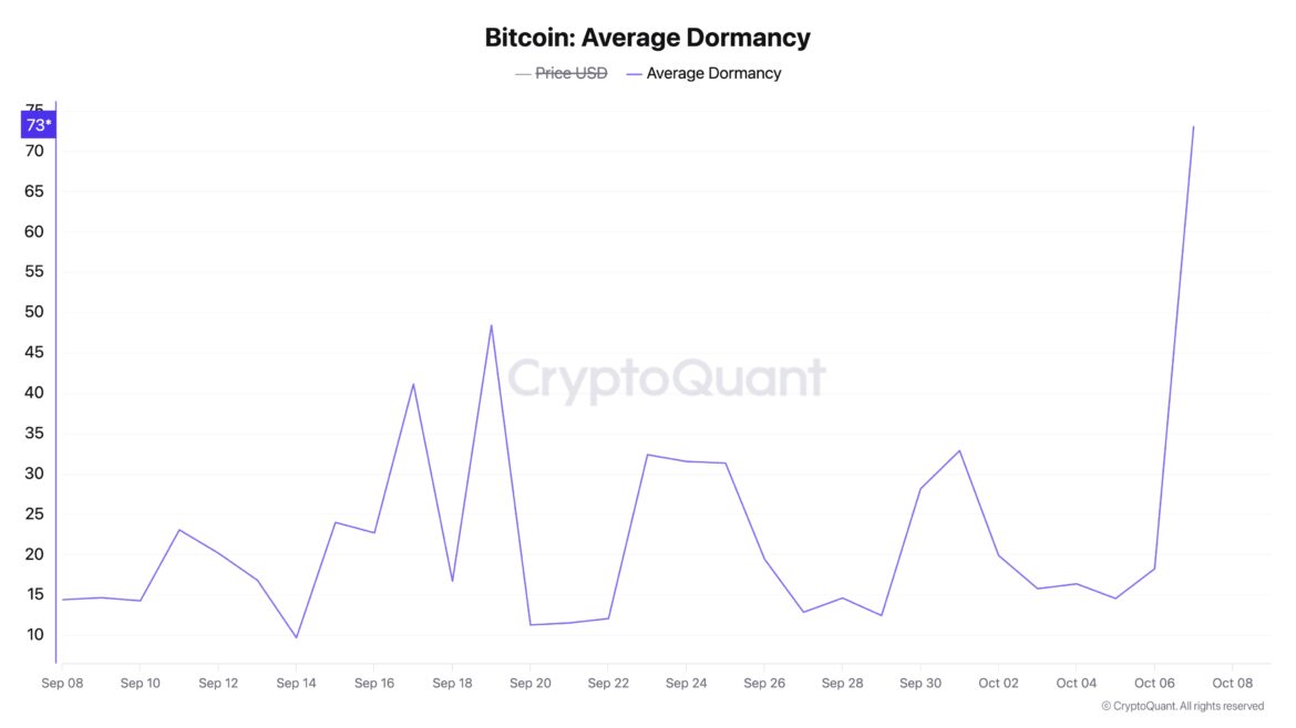 Bitcoin’s (BTC) on-chain metrics are signaling a notable shift in behavior among long-term whales, with average dormancy climbing to its highest level in a month in early October 2025.
