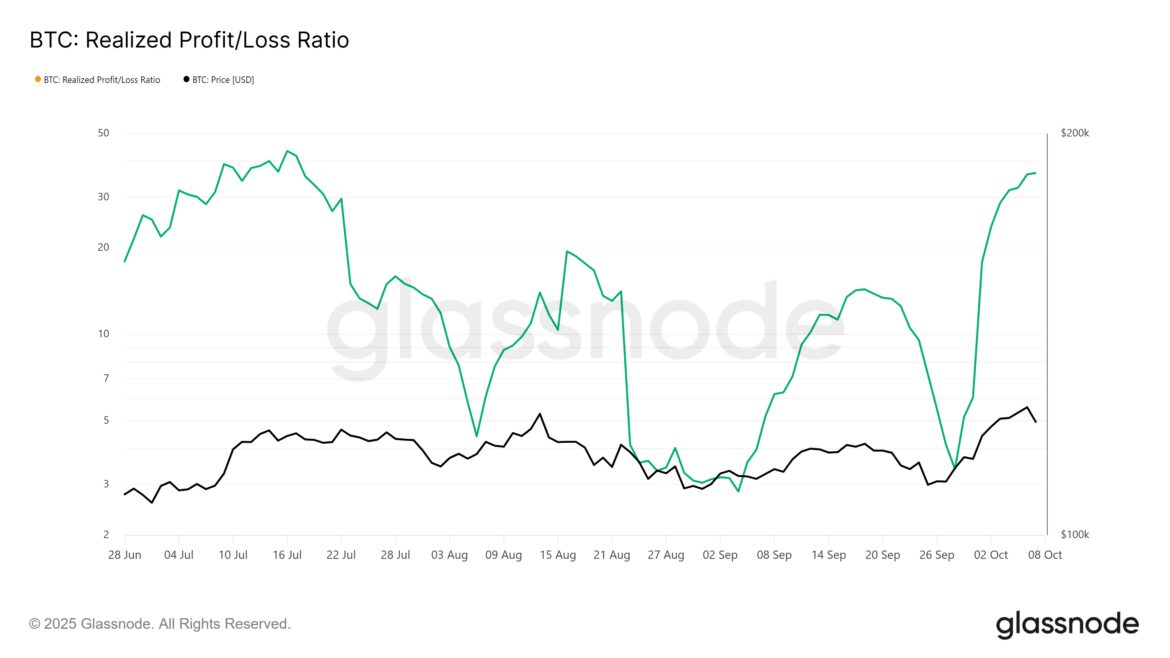 The Realized Profit/Loss ratio, a key on-chain metric, reveals that Bitcoin investors have been selling over the past several days. The indicator recently reached a three-month high, confirming that profit-taking has intensified after the asset’s strong price surge. This pattern is typical following an extended bullish run.