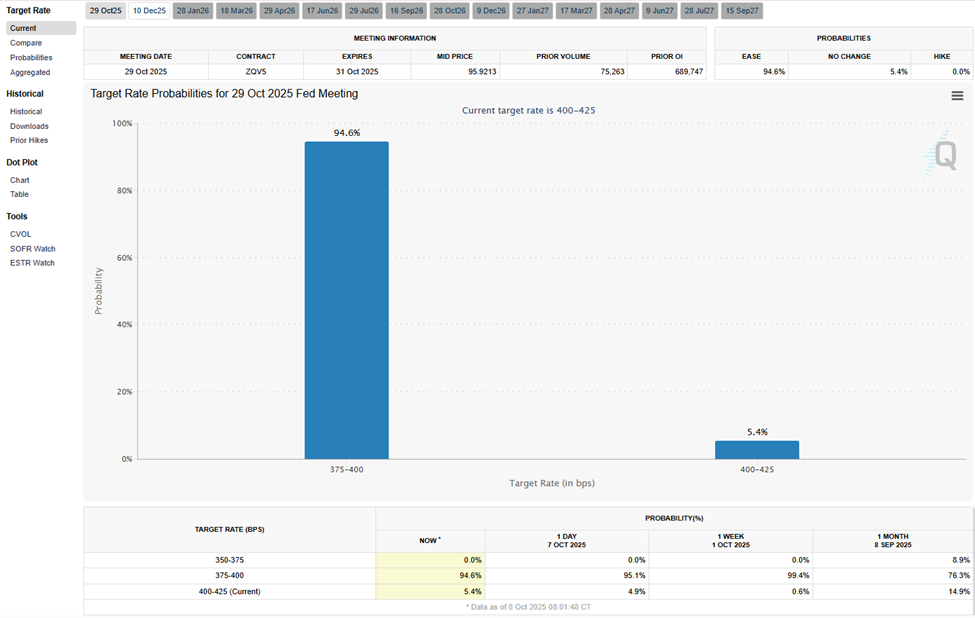 The surge has coincided with renewed speculation, reported in a recent US Crypto News publication, that the Federal Reserve will continue cutting rates following its 25bps move on September 17. Traders assign over a 94.6% probability to another cut by late October.