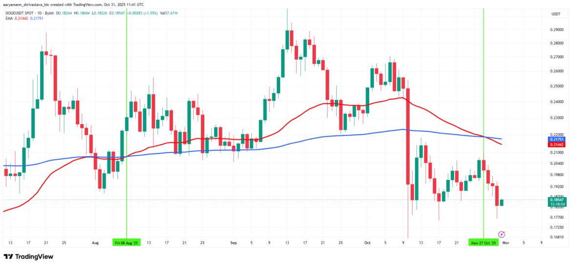Dogecoin’s Exponential Moving Averages (EMAs) have now formed a Death Cross — a bearish technical signal that typically marks the end of extended bullish trends. This crossover occurs when the 50-day EMA falls below the 200-day EMA, confirming the loss of upward momentum. The event ends nearly three months of positive sentiment for DOGE.