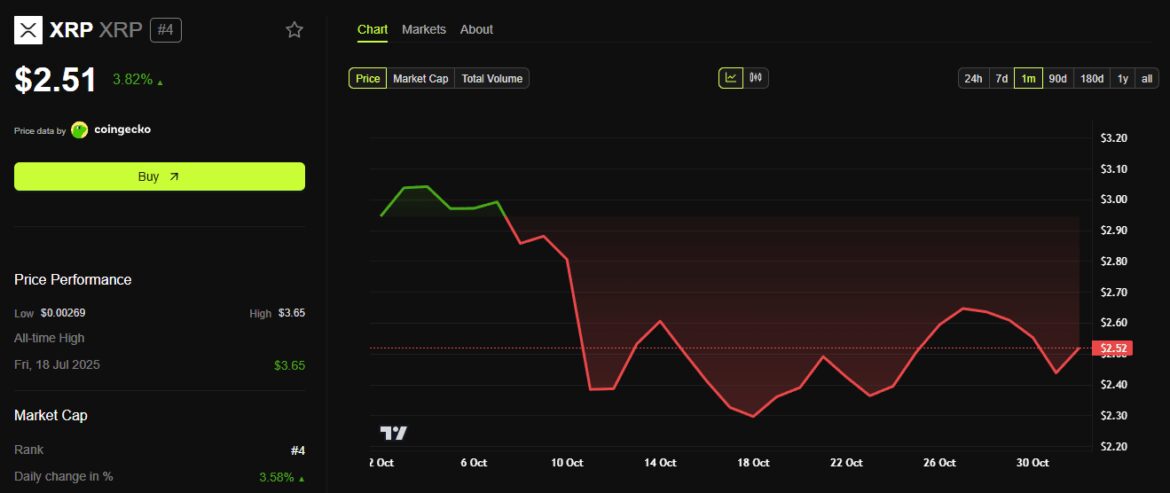 Meanwhile, XRP price also saw strong technical activity in October, briefly breaking resistance at $2.63 before retracing amid wider crypto volatility following the Federal Reserve’s latest policy move.