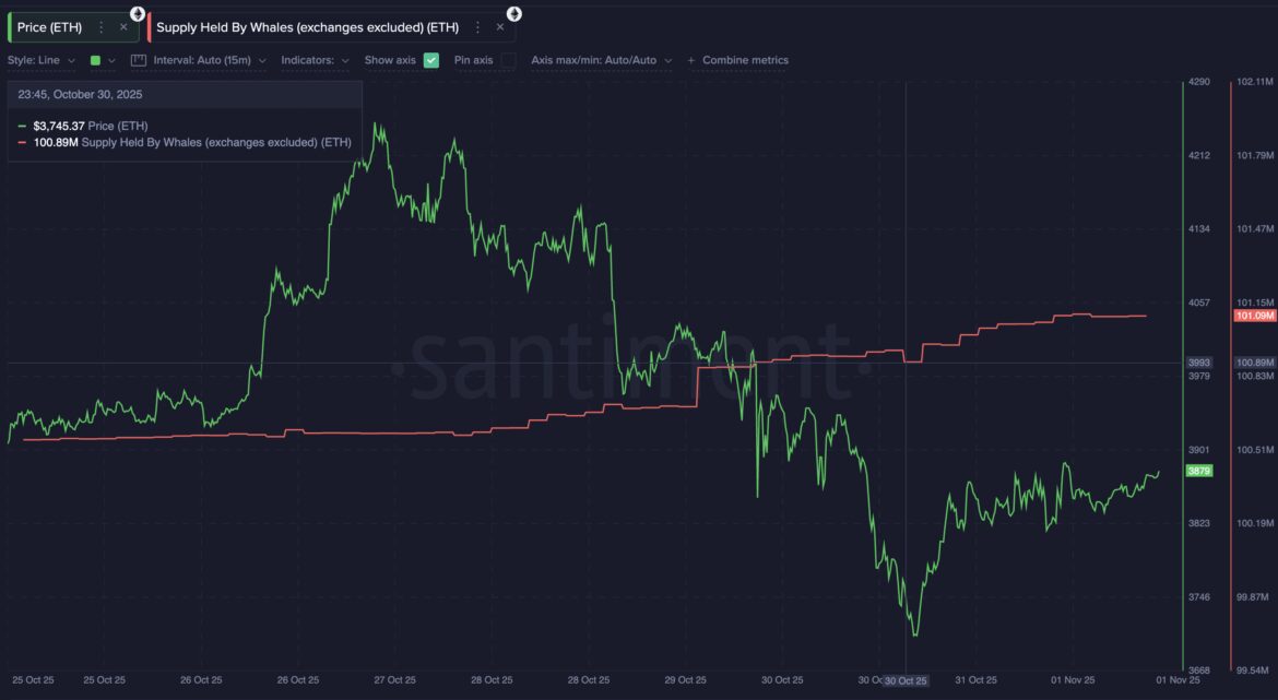 Ethereum whales are buying again, a pattern that resumed right before Halloween. On-chain data shows their combined holdings have grown from 100.89 million ETH to 101.09 million ETH in the past 48 hours.