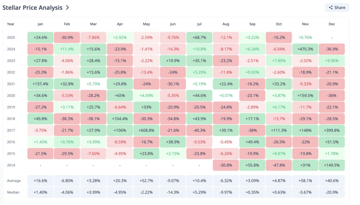 Historically, November has been unpredictable for Stellar. The token’s average gain of +58% looks impressive, driven by massive rallies like +470% in 2024 and +159% in 2020.