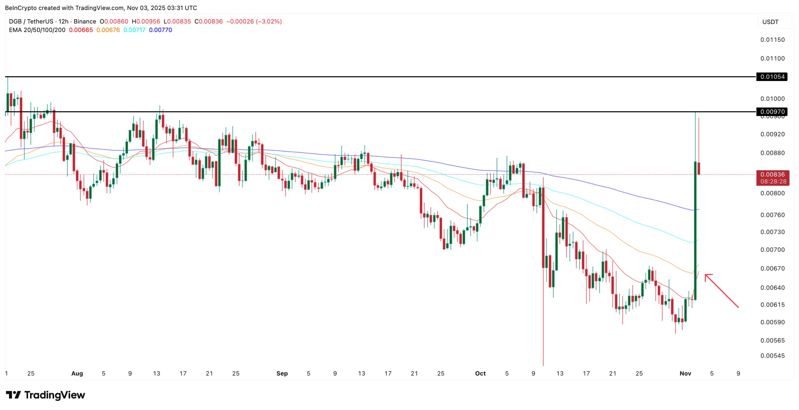 If that crossover completes, DigiByte could gather more strength to retest the higher resistance levels it hasn’t cleared since early August. The first set of targets would then stand near the $0.0093-$0.0097 zone, adding roughly 11–15% to current levels.