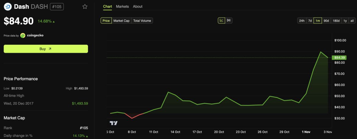 Dash (DASH), a privacy-focused cryptocurrency, has surged more than 65% over the past week, reaching a three-year high yesterday.