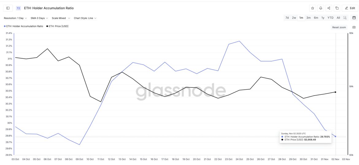 The holder accumulation ratio — which measures how much existingEthereum wallets are adding to their balances — has slipped to 29.79%, its second-lowest level in a month. The last similar drop, on October 9 (29.66%), triggered a 14% fall from $4,370 to $3,750.