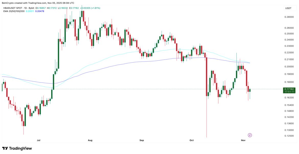 On the daily chart, HBAR shows two signals moving in opposite directions. A bearish crossover is forming between the 100-day and 200-day Exponential Moving Averages (EMAs). EMAs smooth out price data to show long-term trend direction.