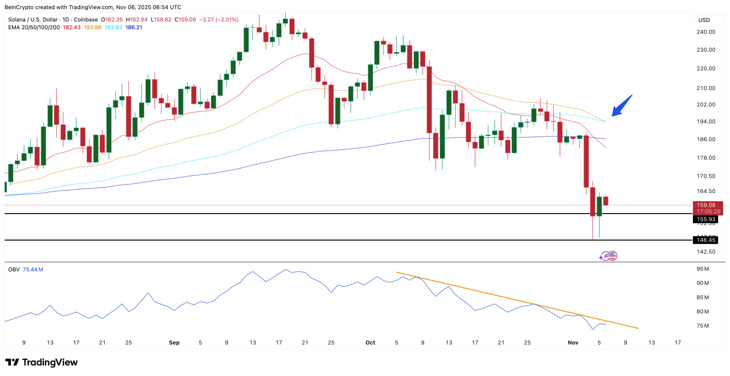 For any recovery to hold, Solana must restore its technical balance. It needs OBV to break above its descending line and the EMA crossover to flatten.