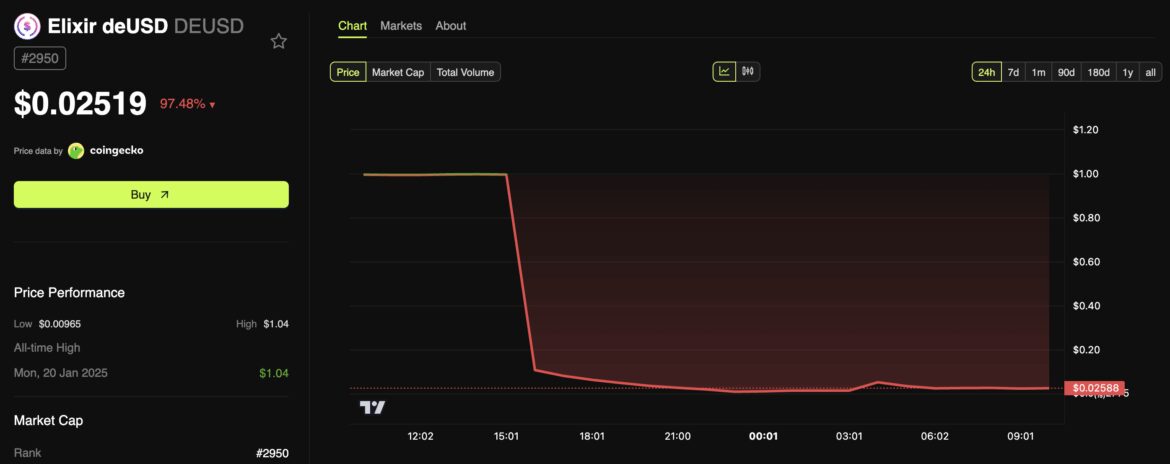 “deUSD holds no value and the stablecoin has been sunset. Please do not buy or make investments into deUSD, including through AMMs,” Elixir added.