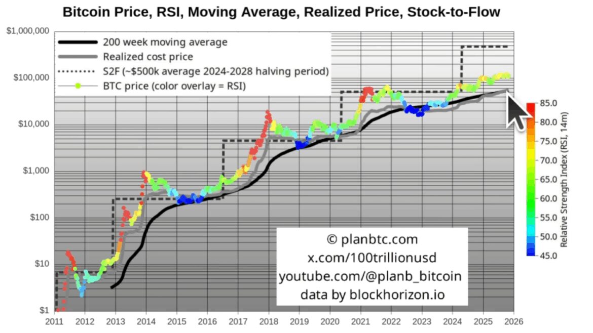PlanB, creator of the Stock-to-Flow (S2F) model, sees the correction as a mid-cycle pause. His data shows Bitcoin has held above $100,000 for six consecutive months. This is a major shift from resistance to support.
