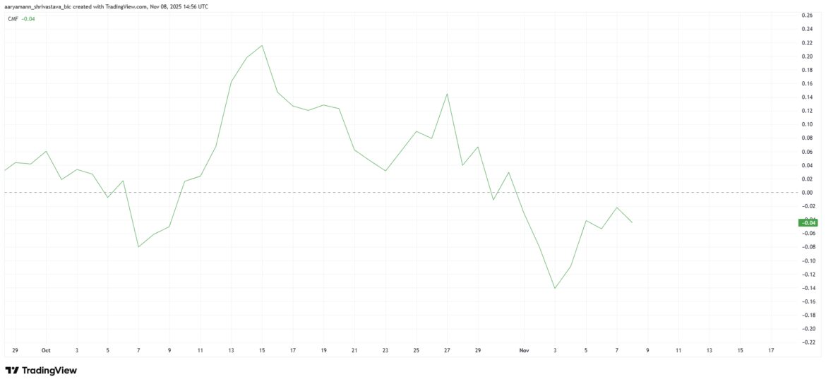 The Chaikin Money Flow (CMF) indicator shows HBAR sitting in the bearish zone below the zero line, reflecting ongoing outflows. Although there has been a modest uptick recently, inflows are still insufficient to reverse the trend. This suggests that sellers maintain control of the market.