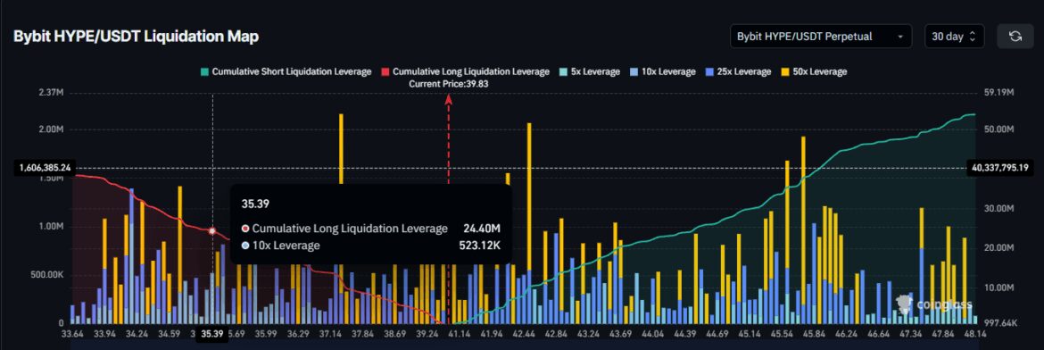 The liquidation map reveals that HYPE long traders could face up to $24.40 million in potential liquidations if the token drops to its month-long critical support at $35.3. This would represent a substantial risk, as it could trigger widespread position closures among leveraged traders.