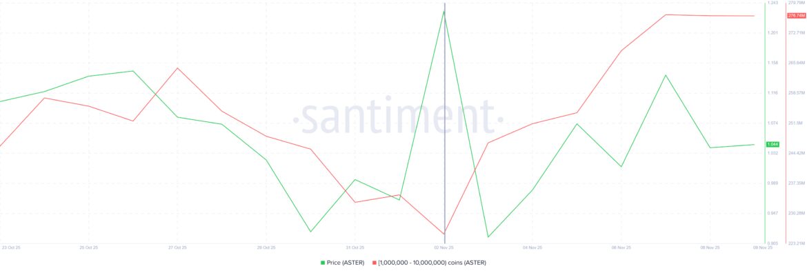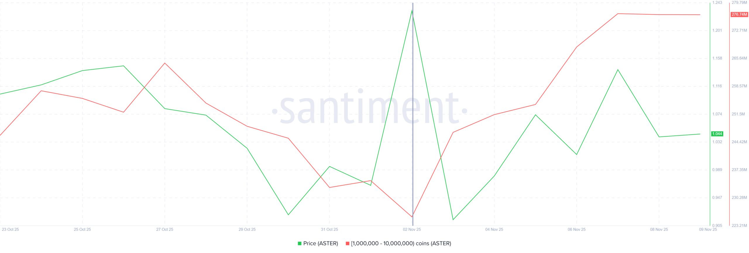 On-chain data reveals that addresses holding between 1 million and 10 million ASTER have accumulated over 51 million additional tokens since the start of November, equating to roughly $53 million in value.