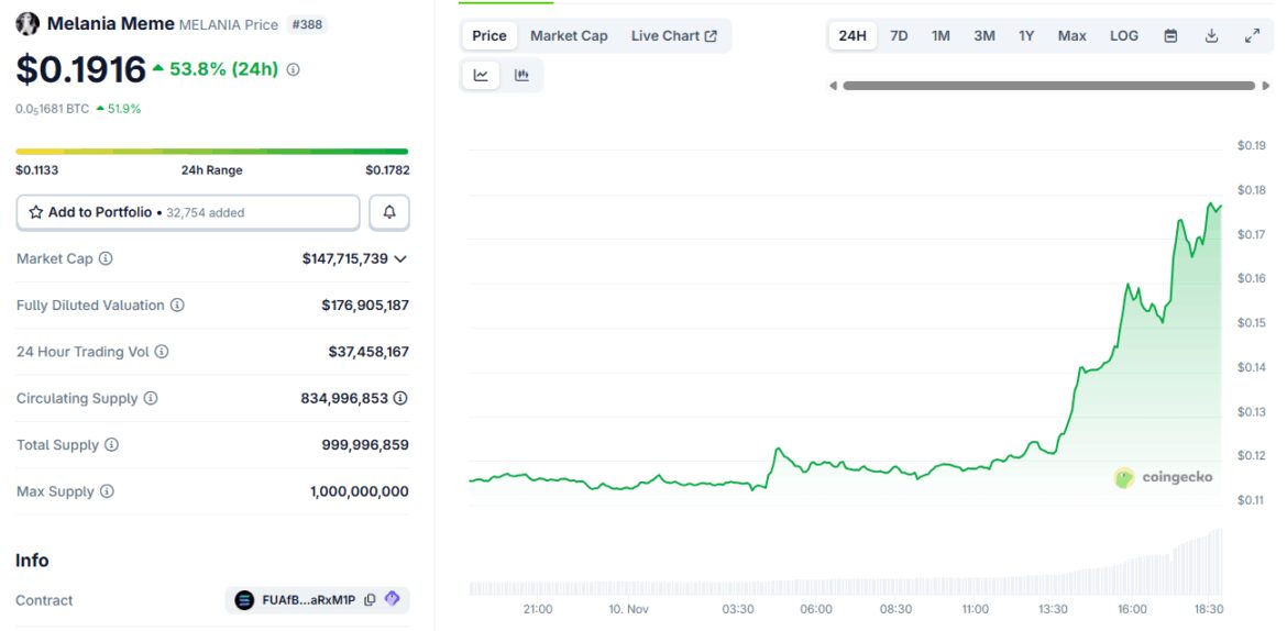 While the wider crypto market remains in turmoil, all Trump-linked coins have surged today without any apparent cause. MELANIA has jumped over 54%, while both TRUMP and World Liberty Financial’s WLFI have gained more than 20%.