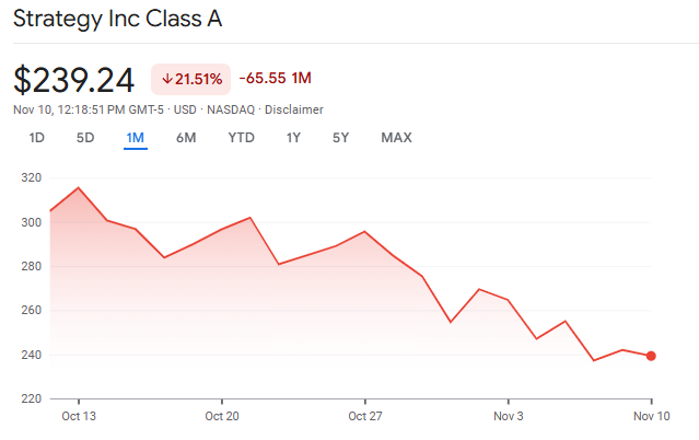 Still, Strategy’s latest actions come amid heightened uncertainty, with both Bitcoin and MSTR shares facing steep declines. The company’s stock has dropped more than 27% in the past month, closely tracking Bitcoin’s retreat from record highs.