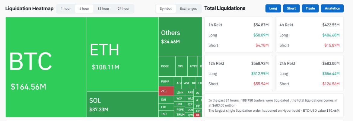 The decline triggered a new wave of liquidations. Data shows over $683 million wiped out in the past 24 hours, including $556 million in long positions. Traders were heavily positioned for upside.