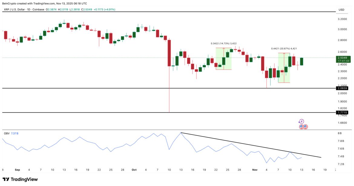 For weeks, XRP has reacted each time the market’s buying and selling pressure — measured through the On-Balance Volume (OBV) indicator — has pushed against the same downward trendline. OBV tracks whether volume is flowing in or out of the asset, and its trend often leads price.