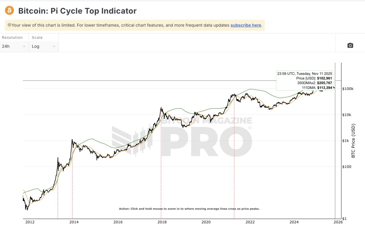 The Pi-Cycle Top Indicator compares two moving averages: the 111-day average and twice the 350-day average. When the 111-day line rises above the slower one, Bitcoin is usually one or two days from the final top. The signal has been precise in every major cycle.