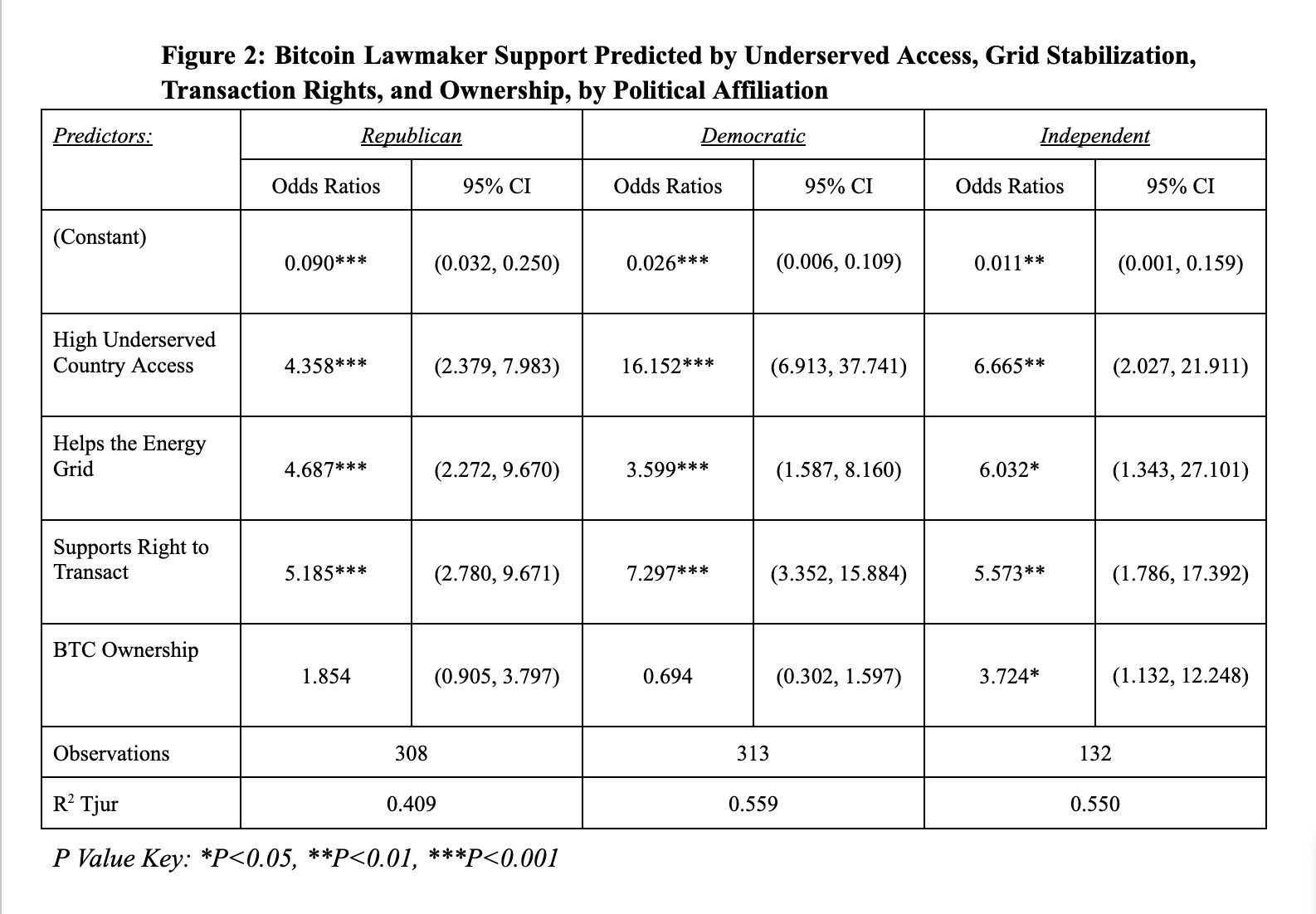 Lastly, Independents show a blended response pattern. Their support for pro-Bitcoin lawmakers is most strongly linked to perceptions that Bitcoin improves access for underserved populations (odds ratio 6.665), followed by energy grid benefits (odds ratio 6.032) and the right to transact (odds ratio 5.573).