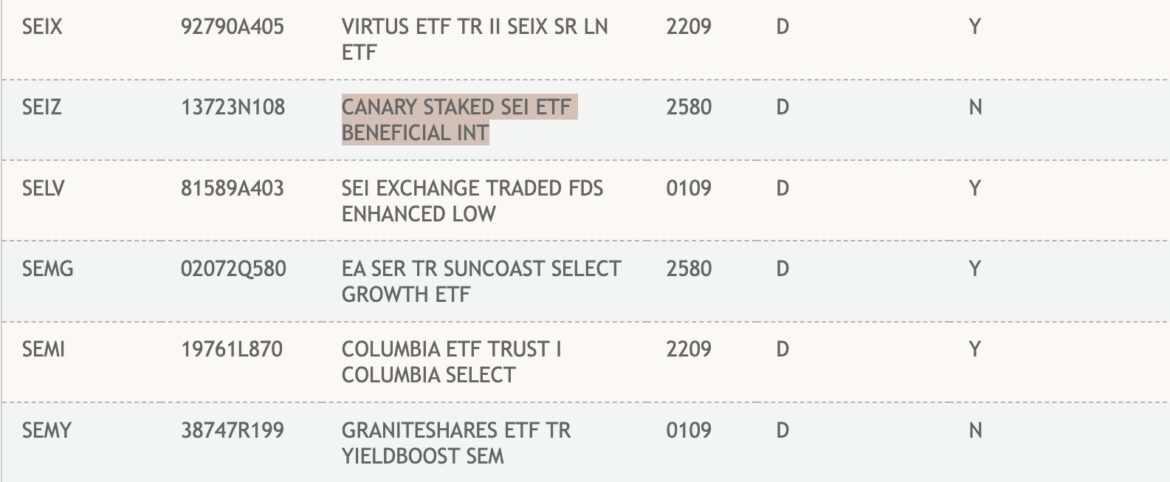 The Canary Staked SEI exchange-traded fund ETF has been officially registered on the Depository Trust & Clearing Corporation (DTCC) platform.