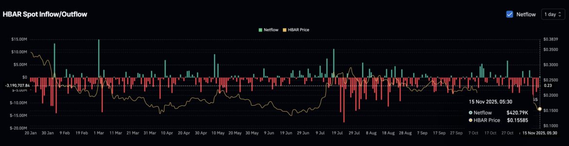 HBAR’s spot flows show a sharp shift in behaviour after the breakdown. On November 14, HBAR recorded –4.03 million in net outflows, meaning more tokens were leaving exchanges as buyers accumulated.