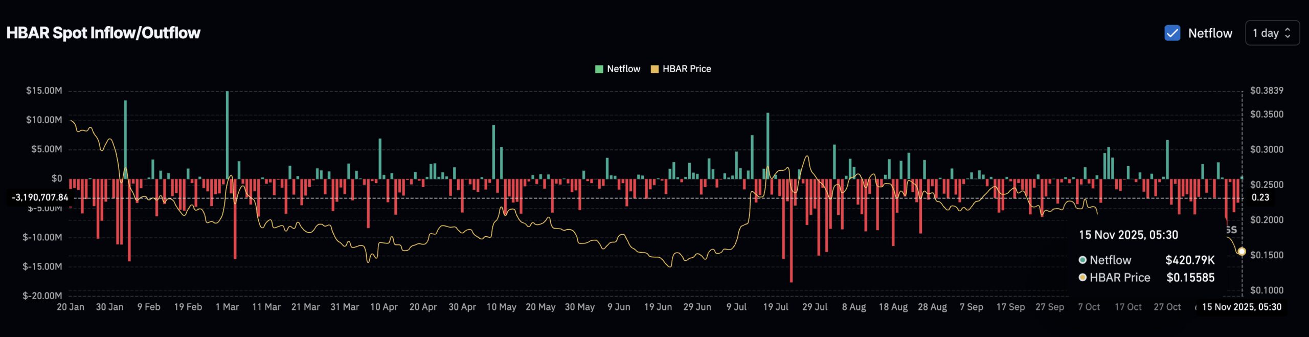 Today, after the pattern breakdown confirmed, flows flipped to +420,790 HBAR.
