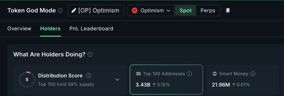 The top 100 Optimism addresses have increased their holdings by 3.15% over the last 30 days. At today’s OP price, that addition is worth roughly $54 million, showing that mega whales are not shaken by market weakness.