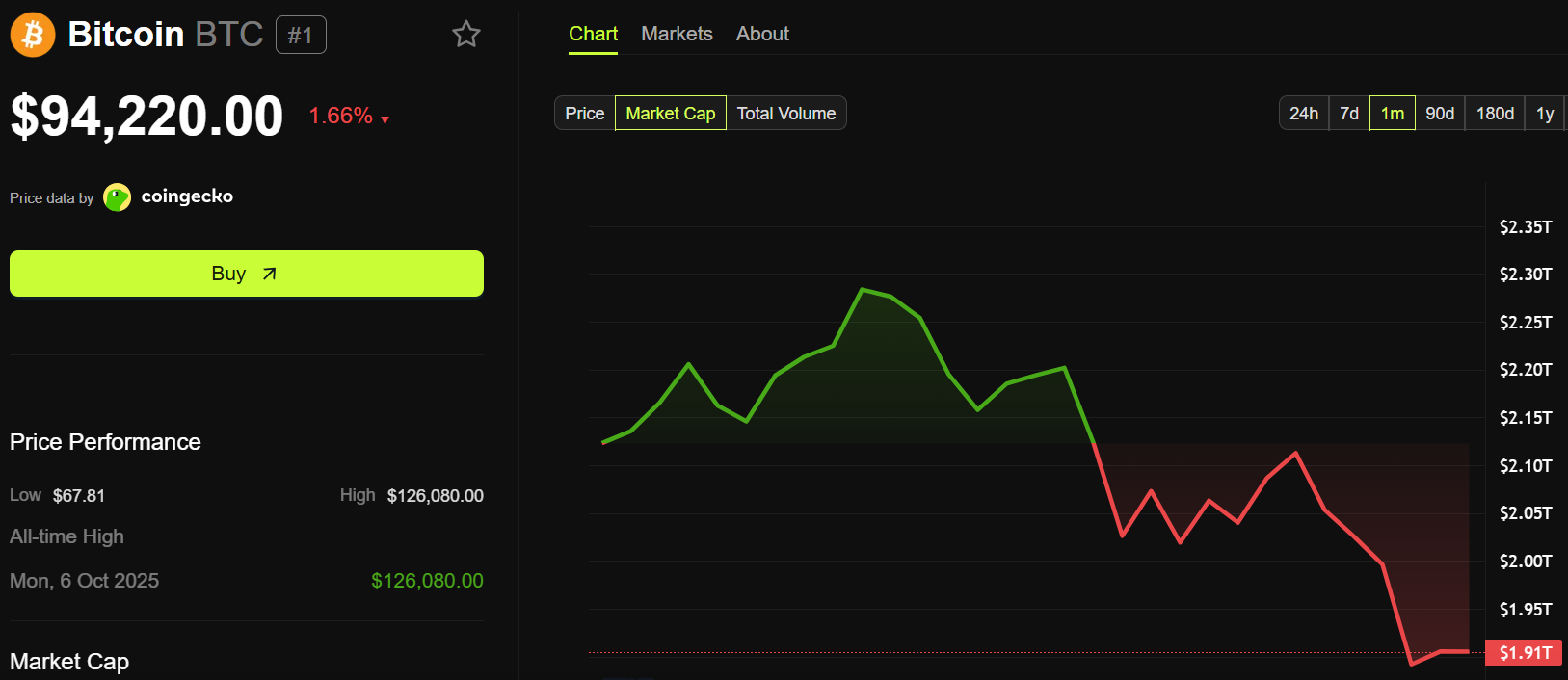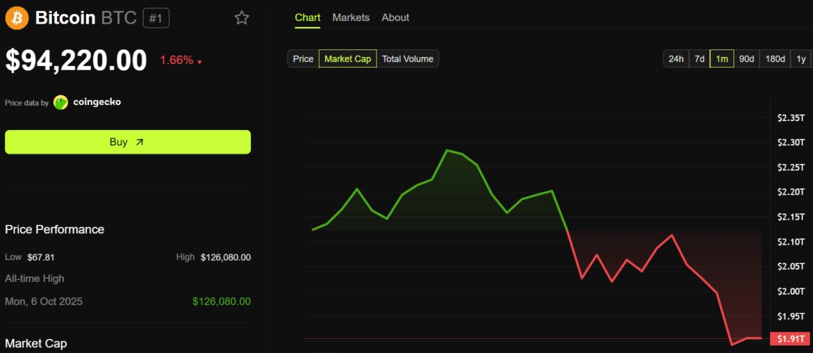 As of this writing, Bitcoin’s market capitalization was approximately $1.91 trillion. The broader cryptocurrency market reached $3.23 trillion.