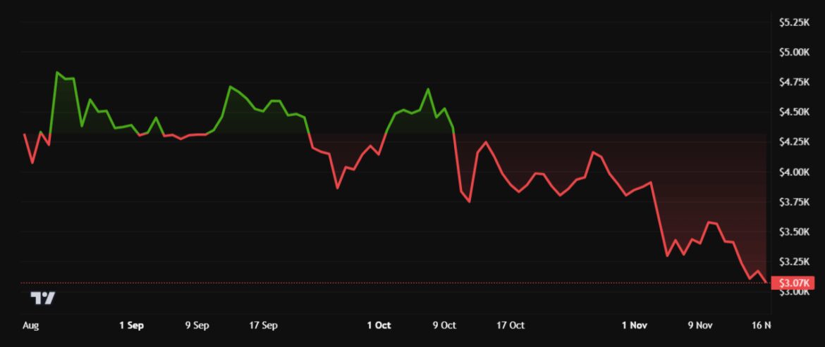 Ether dropped below $3,100 for the first time since November 4, 2025, trading at $3,066 at 9:36 PM UTC on November 16, down 3.4% over 24 hours. This decline reflected broader weakness in digital assets and a view that ETH carries a higher risk than Bitcoin.