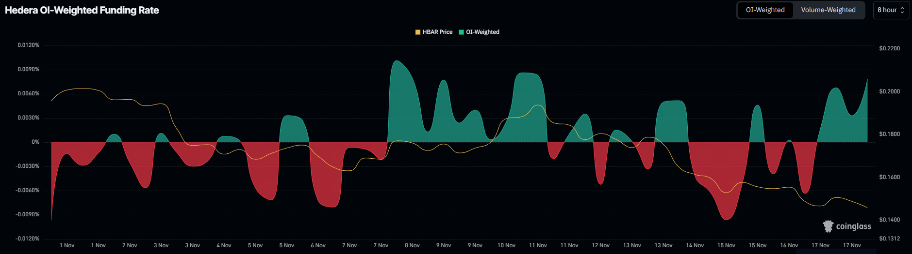 The lack of clear sentiment direction is bearish for Hedera at this stage. Funding rate instability typically signals indecision, which can weaken support levels and extend volatility during downtrends.