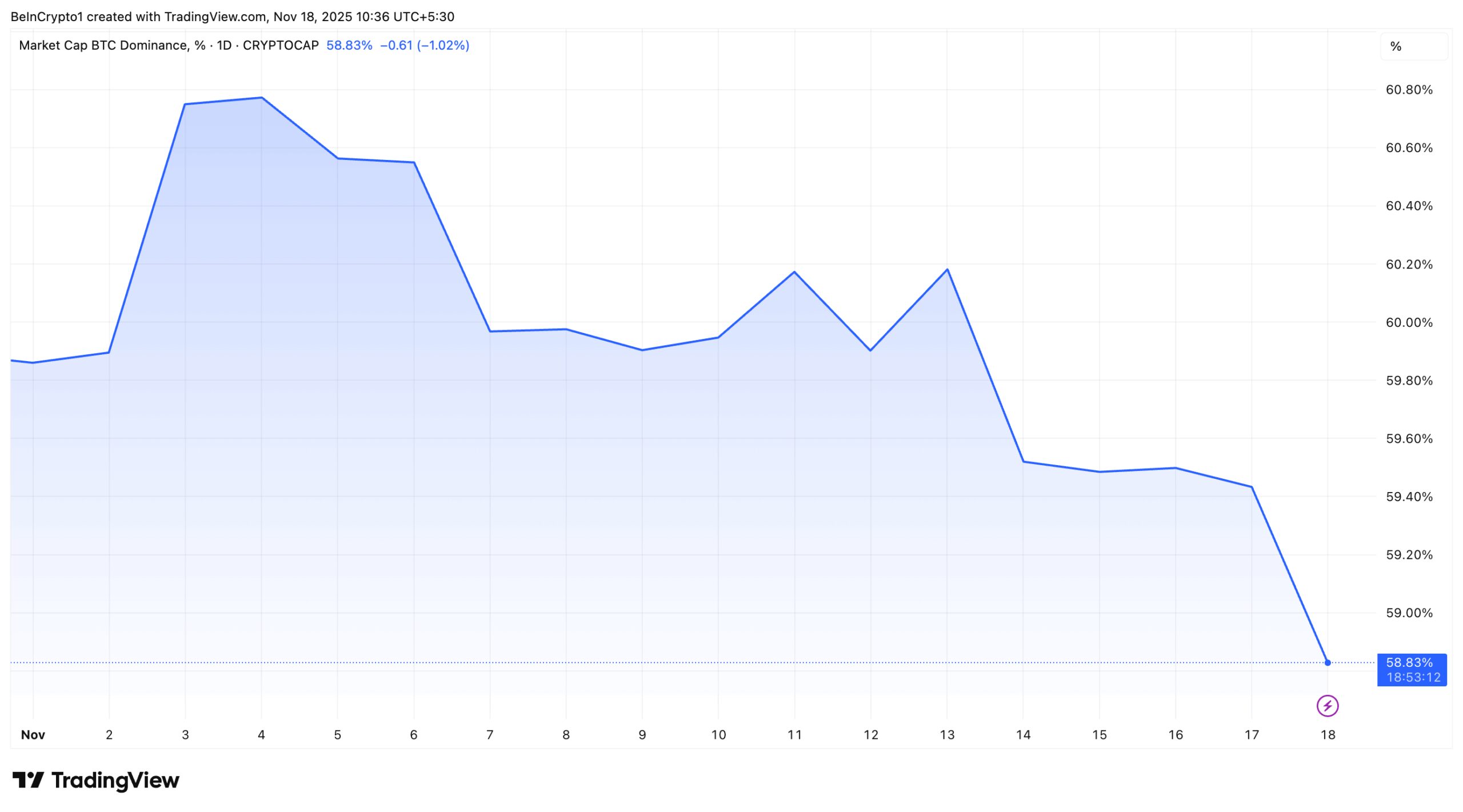 According to market data, BTC.D declined notably in November 2025, falling from 61.4% to a current value of 58.8%.