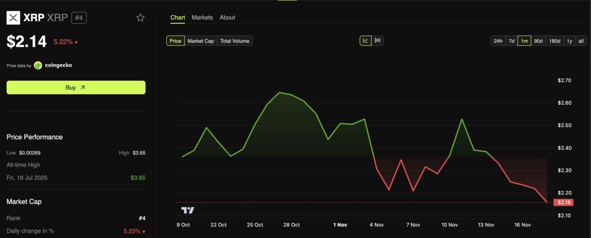 Despite these inflows, XRP’s price has declined around 11% since November 13. BeInCrypto Markets data revealed that the altcoin was trading at $2.14 at press time, down 5.22% over the past day.
