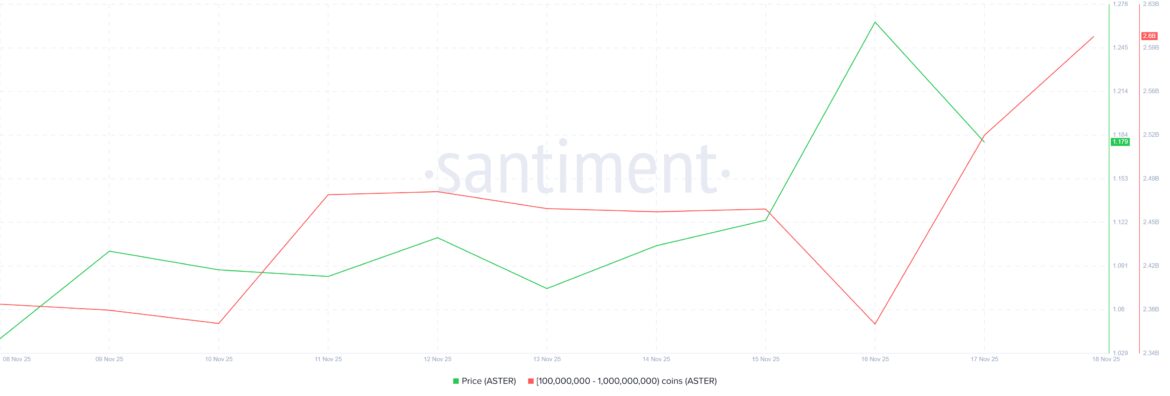 Whales have taken an aggressive position in ASTER, signaling a decisive shift in market sentiment. In the past two days, addresses holding between 100 million and 1 billion ASTER accumulated nearly 230 million tokens. This buying spree, valued at more than $310.5 million, highlights strong conviction from high-value investors.