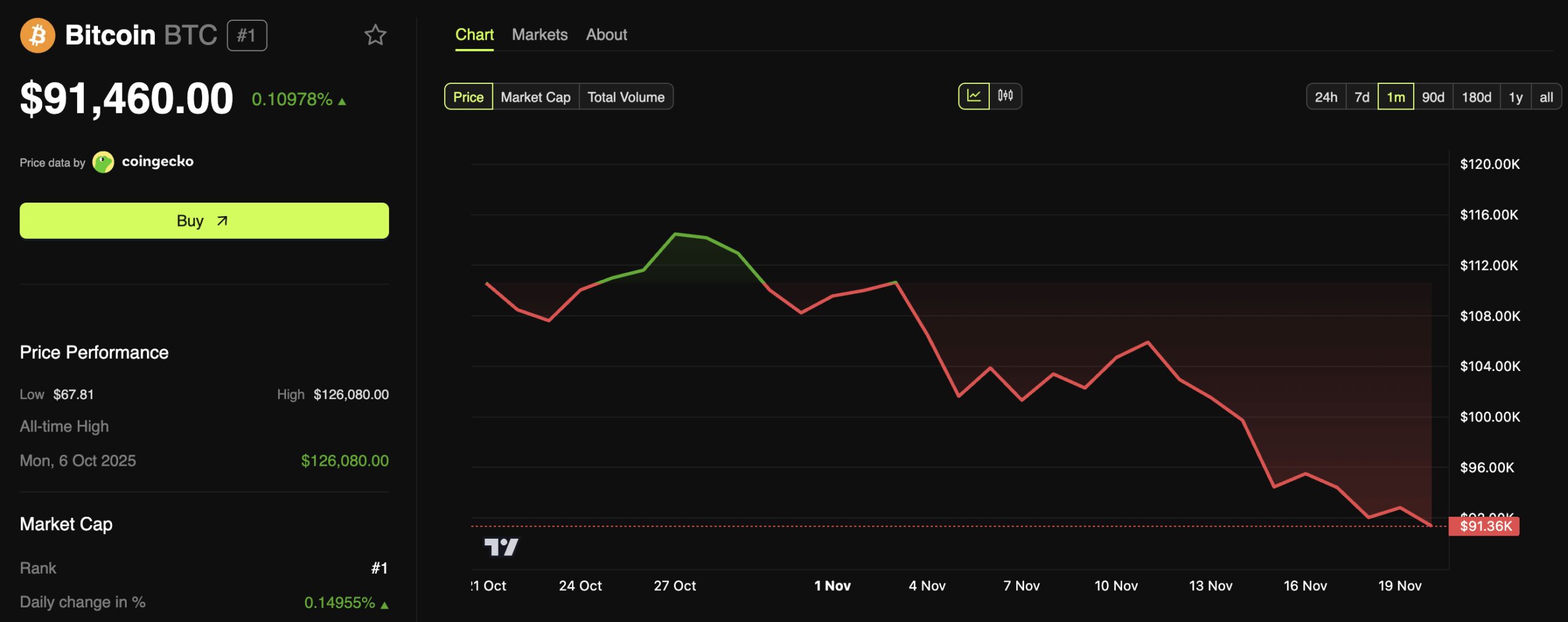 BeInCrypto Markets data showed that it was trading at $91,460 at the time of writing. This represented a 0.109% increase over the past 24 hours.
